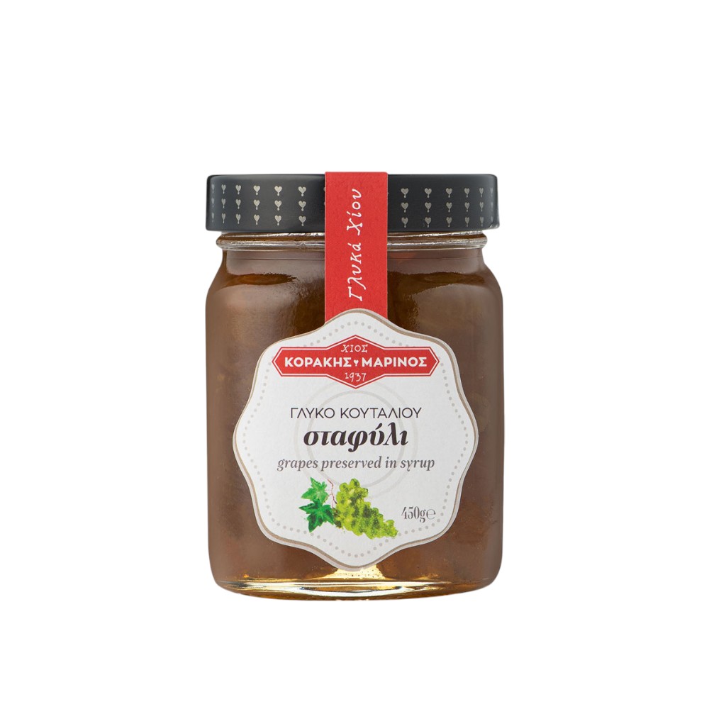 Σταφύλι (60%), Ζάχαρη, Σιρόπι Γλυκόζης, Μέσο οξίνισης: Κιτρικό οξύ, Συντηρητικό: Σορβικό Κάλιο (έως 0,1%), Αρωματικές ύλες. Το εργοστάσιο επεξεργάζεται και καρπούς με κέλυφος.